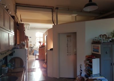 Außer den Naßräumen sind nahezu alle Räume mit Linoleum ausgestattet. Individuelle Oberbodenbeläge wurden, wenn gewünscht, von den Nutzer:innen selbst fachgerecht eingebracht.